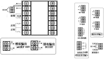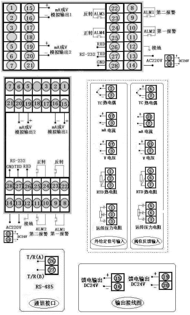 通讯方式RS485,输出方式为继电器输出,PV输入类型为4~20 mA,SV输入类型为4~20 mA,D一报警为下限报警,D二报警为上限报警,DC24V馈电输出,DC24V供电。