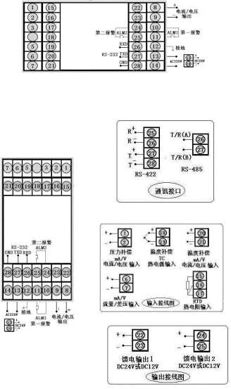 带补偿输入,通讯方式RS-232,输出方式为继电器输出,输入类型为D一路0~10 mA,D二路1~5V,D一报警为上限报警,D二报警为下限报警,单路DC24V馈电输出,DC24V供电,竖表。