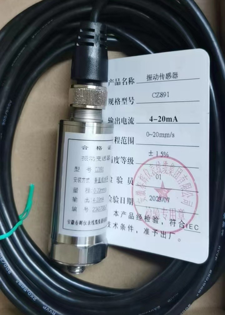 CZ891振动传感器是一种小型一体化、独立两线制、探头式变送器。它的两路4~20mA输出信号分别与被测物体振动速度的真有效值(烈度)和测量点温度变化成正比。该变送器安装简便,价格低廉,非常适用于对各类大、中型旋转机械和运动设备(如风机、水泵、减速机、轴承座、滚动磨擦体等),进行振动稳定和温升稳定的在线测量。