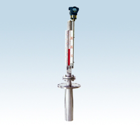 该产品由本体(由上、下导管组成)、翻板箱(由红、白双色磁性小翻板组成)、浮子(由磁体、顶杆、浮筒 组成)、以及液位变送器等组成,其结构如图所示。工作原理为:容器内的浮筒(按不同介质和压力针对研制), 在下导管中随液面高度的变化而上下浮动并通过顶杆使磁体在上导管内上下移动,促使本体外的翻板翻动 并显示红、白颜色来指示液面高度,同时液位变送器将液位信号传送至控制中心进行液位指示和控制,也 可通过计算机进行集中监控。